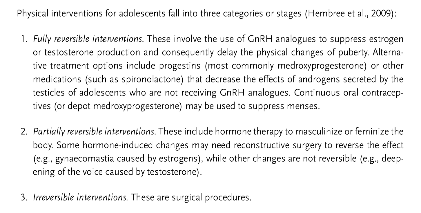 WPATH lays this out very clearly in a staged approach to treatment for adolescents. The first step is puberty blockers, which are classified as fully reversible. The second step is gender-affirming hormones, testosterone or oestrogen, which are partially reversible. Some changes, like voice deepening from testosterone, cannot be reversed, while others can. The third step is surgery, which is irreversible. Nobody disputes that.